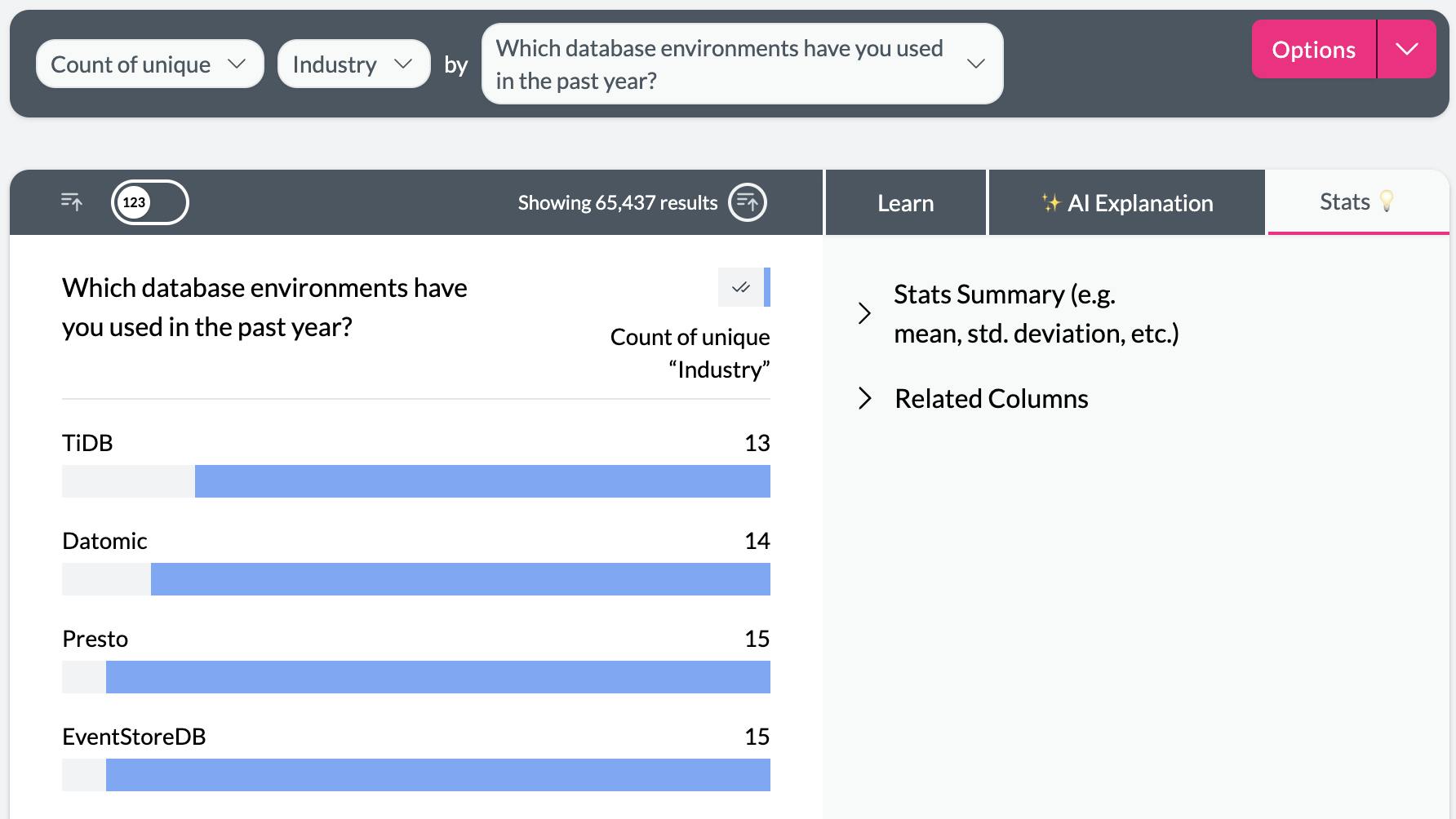 This is another example showing the "Count Unique" aggregation option. Here we can see the unique industries represented per database environment (this is from a developer survey).