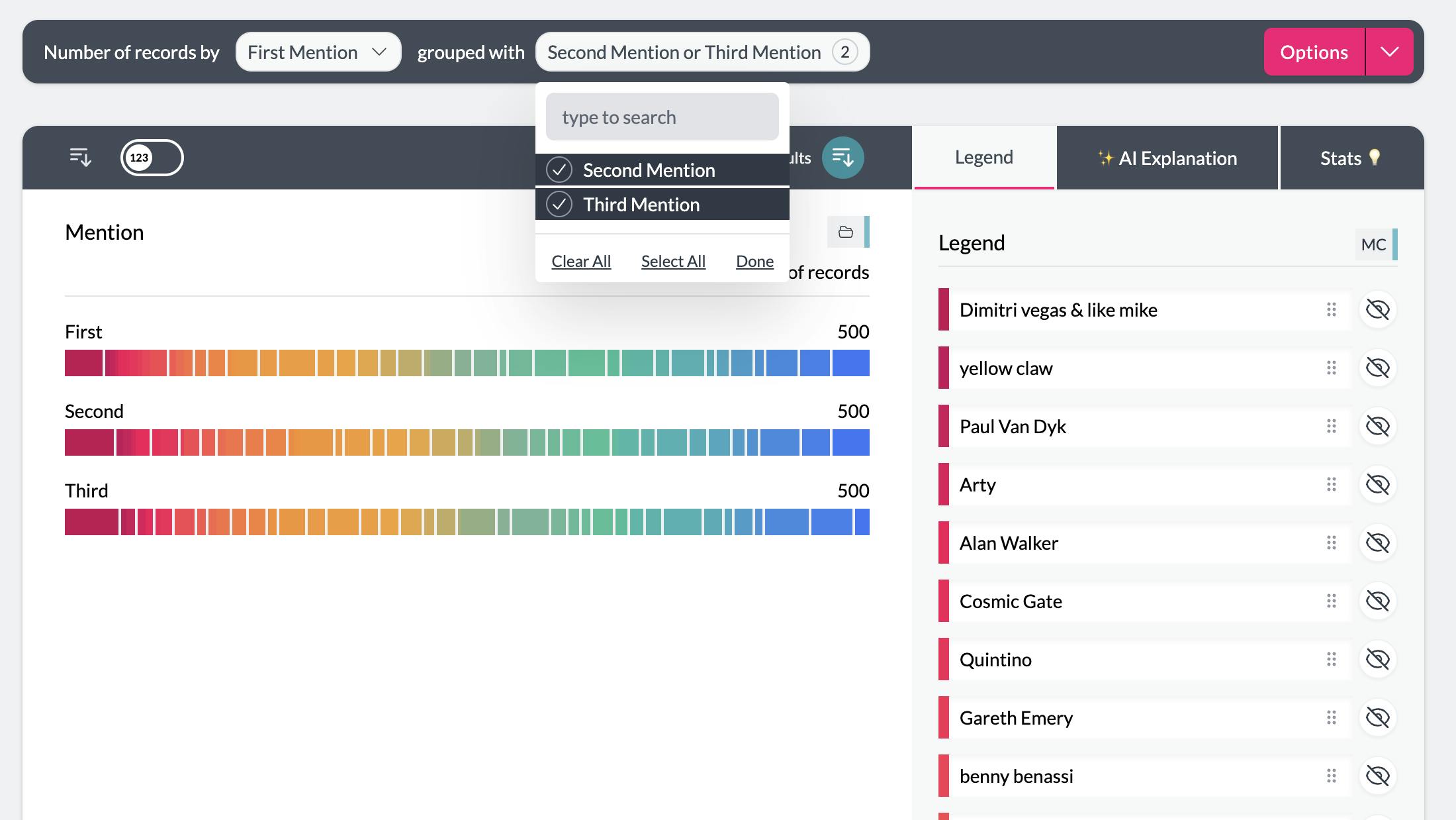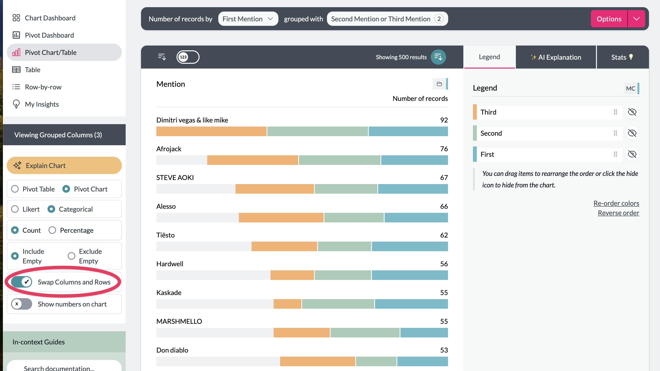 In this example, swapping the columns and rows allows you to see the artists mentioned across all three grouped columns, ordered by the total mentions.