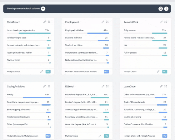 - Add filters by clicking on a response in that record [0.28]. In the tutorial example, we filter by developers who learned to code using "Other online resources (e.g. videos, blogs, forums)" by clicking on that response.
